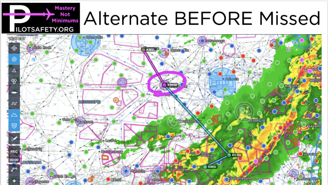 Why would you ever fly into convective activity, go to KCXU, and then to KMAI if you go missed? It makes a lot more sense to stop halfway at KBHM before you get into bad weather!