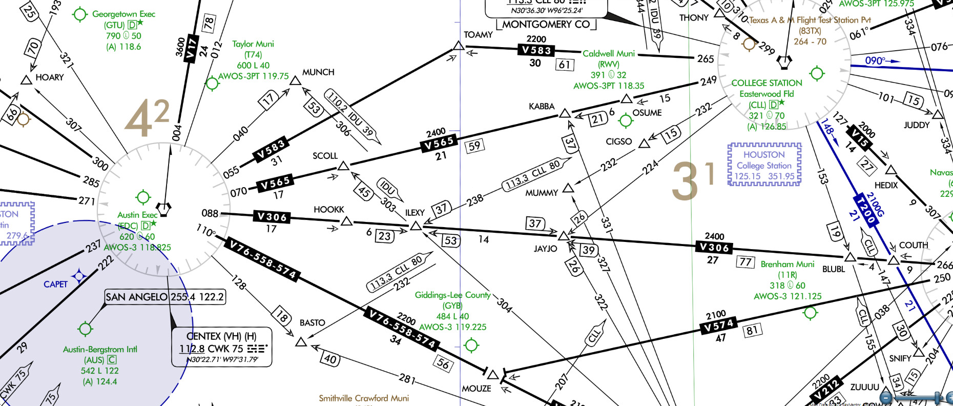 Let's back up a few miles to see how you would use them early in the scenario. You departed KCLL and were vectored to join V565 to CWK (Centex Vortac), which is just northeast of Austin. Your first two fixes are OSUME and KABBA, and you identified CLL and IDU (Industry Vortac) once aloft.